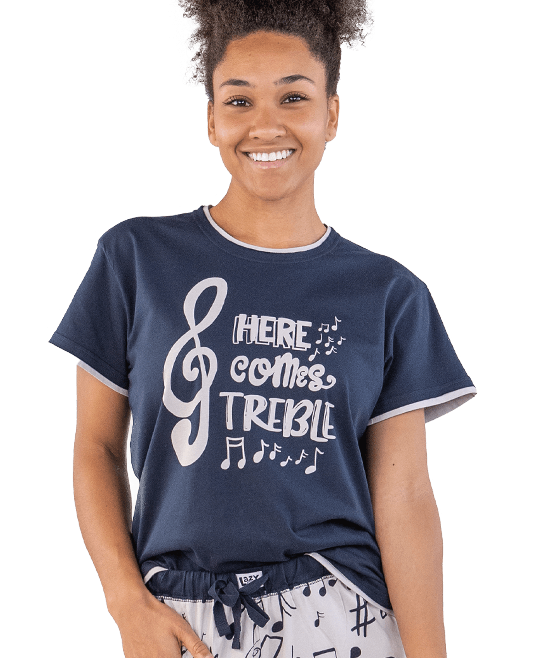 Get in tune with comfort with our Here Comes Treble Women’s Tee. Made from breathable 100% combed cotton for a soft blend of warmth and comfort, each tee features raw-edged trim around the neck and sleeve. Matching pj pants can be purchased separately.