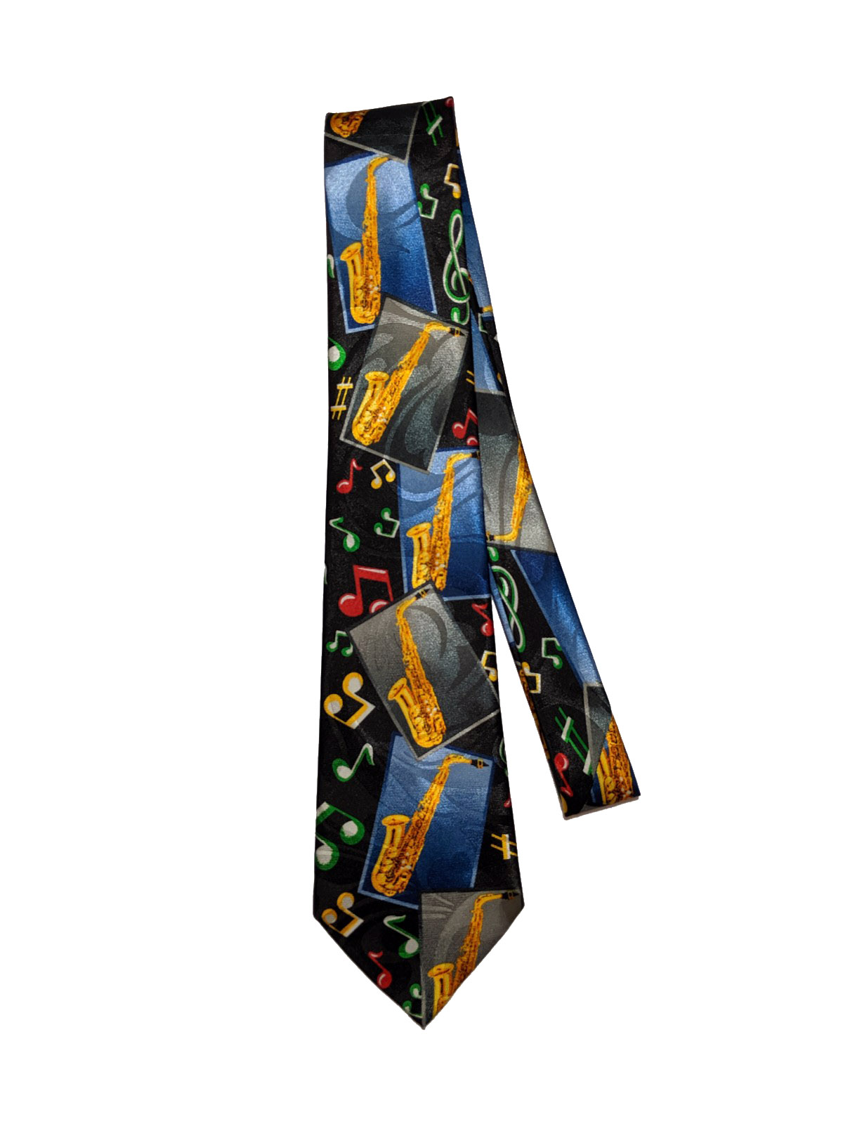 Steven Harris Music Tie; Black tie with Saxophones and Green, Red, & Yellow Music Notes.